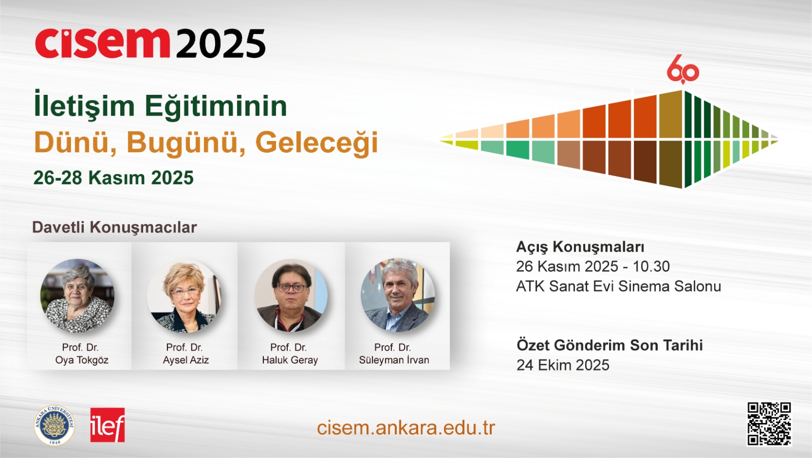 Cumhuriyetin 100. yılında ilkini düzenlediğimiz Cumhuriyet ve İletişim Sempozyumu’nun (CİSEM) üçüncüsünü gerçekleştiriyoruz. Bu yıl, aynı zamanda Cumhuriyetin köklü kurumlarından biri olan Ankara Üniversitesi İletişim Fakültesi’nin (İLEF) 60. kuruluş yıldönümü! Bu anlamlı kesişme, CİSEM2025’i daha da özel kılıyor. İletişim eğitiminin Türkiye'deki gelişimine öncülük eden, bünyesinde yapılan akademik çalışmalarla alana önemli katkılar sunan İLEF’in ev sahipliğinde gerçekleşecek CİSEM2025’in temasını bu nedenle “İletişim Eğitimi” olarak belirledik. İletişim eğitiminin geçmişini, mevcut durumunu ve geleceğini; eleştirel, özgürlükçü ve bütüncül bir bakış açısıyla tartışmak için sizleri CİSEM2025’e davet ediyoruz.